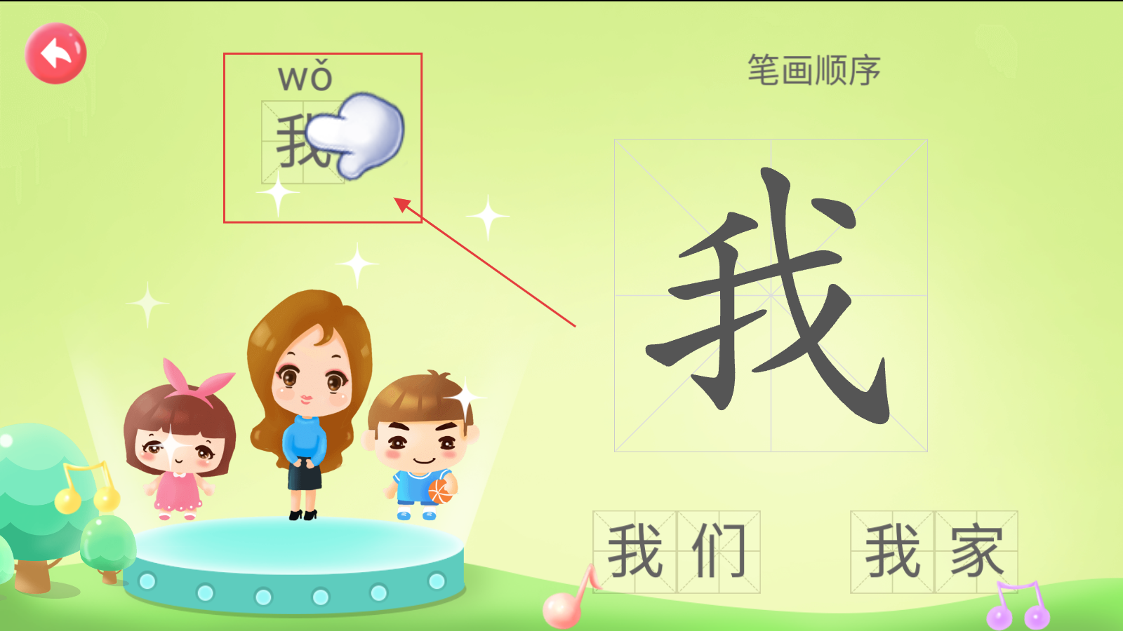 4、学“我”字,跟手指提示学习读音,看笔画顺序,用“我们”“我家”练习组词。