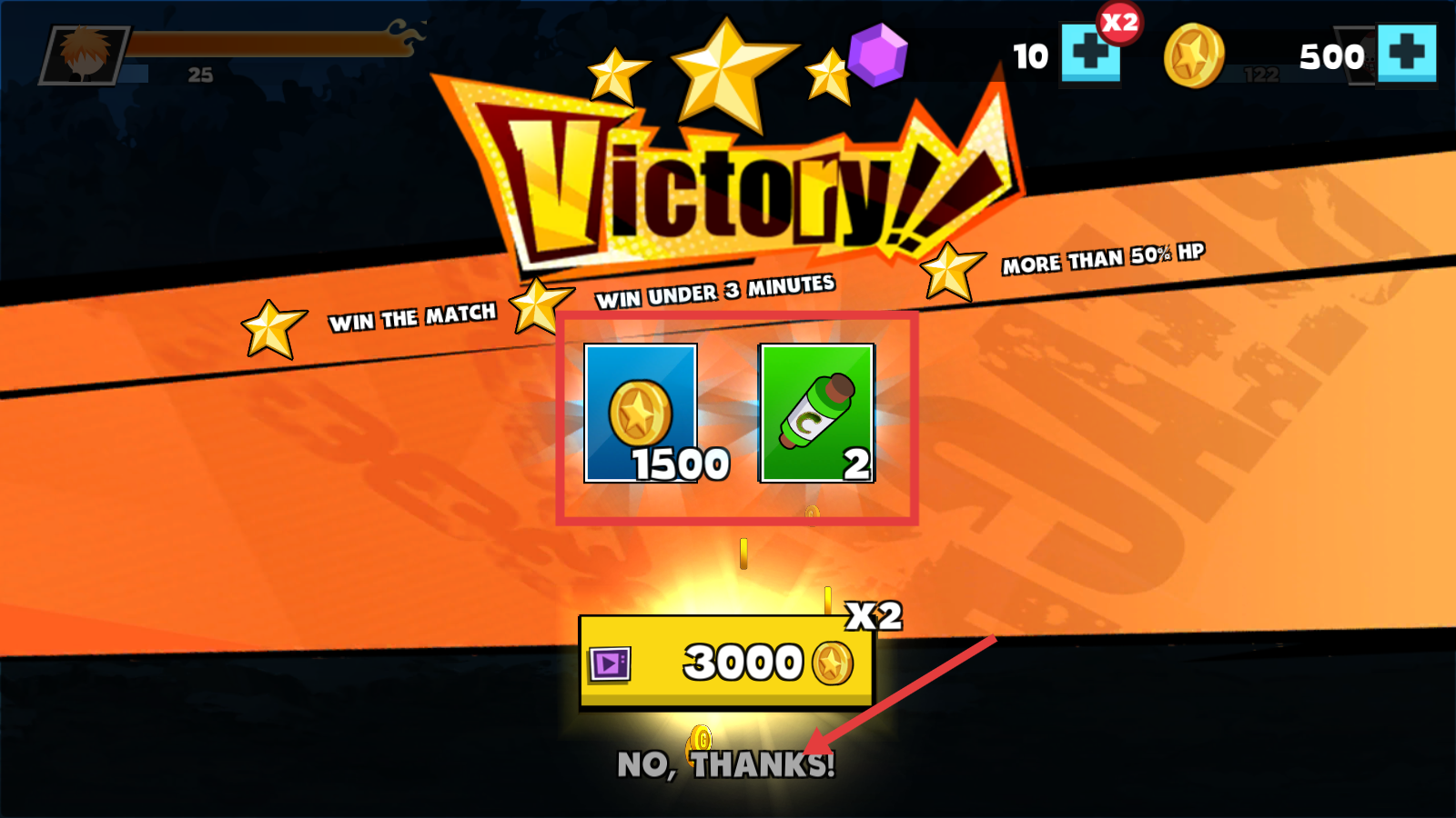4、领取【1500金币+2瓶药水】,点【NO,THANKS!】,继续挑战。