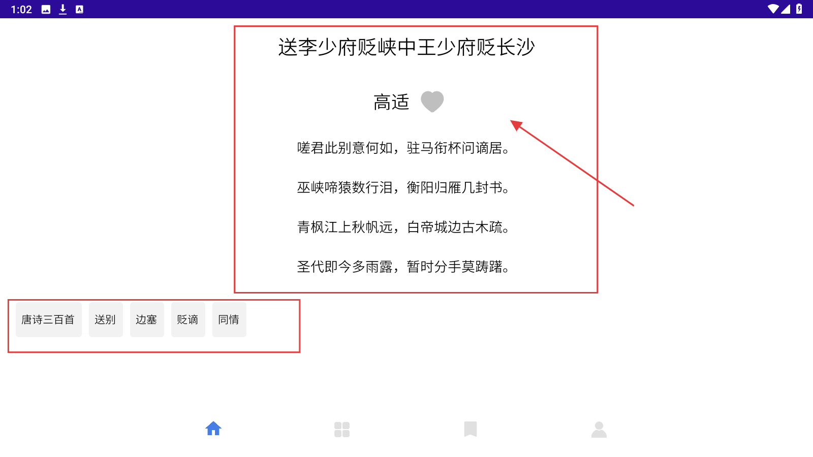 2、进入单首诗词页,像【送李少府贬峡中王少府贬长沙】,查看内容与标签,加深对诗作理解。