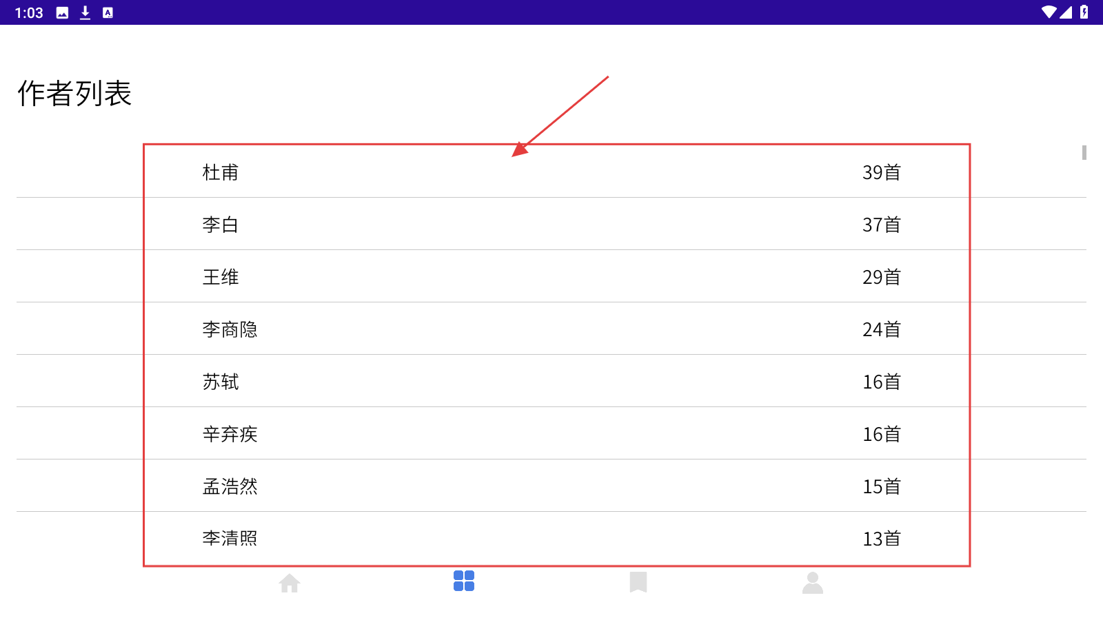 3、打开【作者列表】,了解不同作者作品数量,如【杜甫-39首】,规划按作者学习诗词。