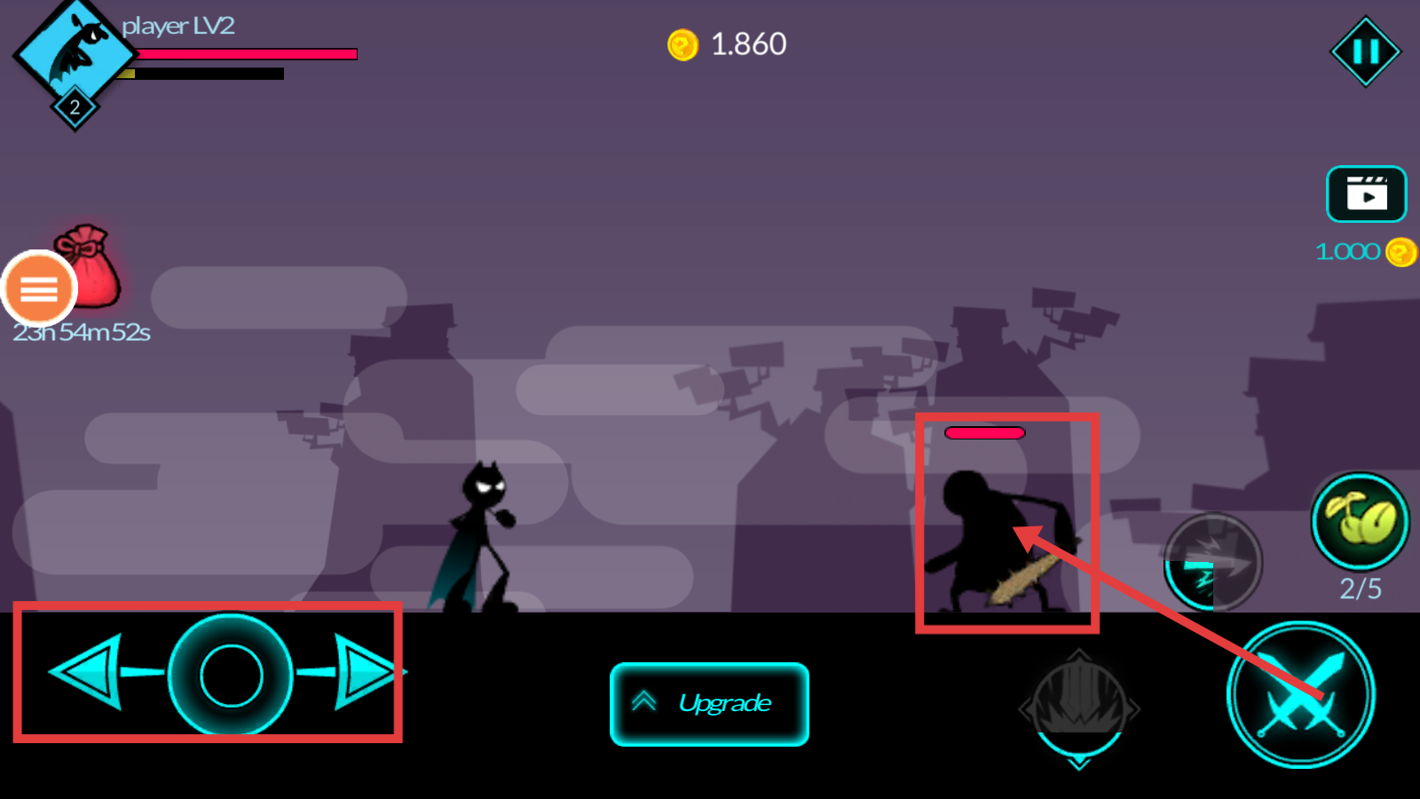 2、战斗中使用左侧【虚拟摇杆】控制移动,接近持械敌人,预判攻击时机准备战斗。