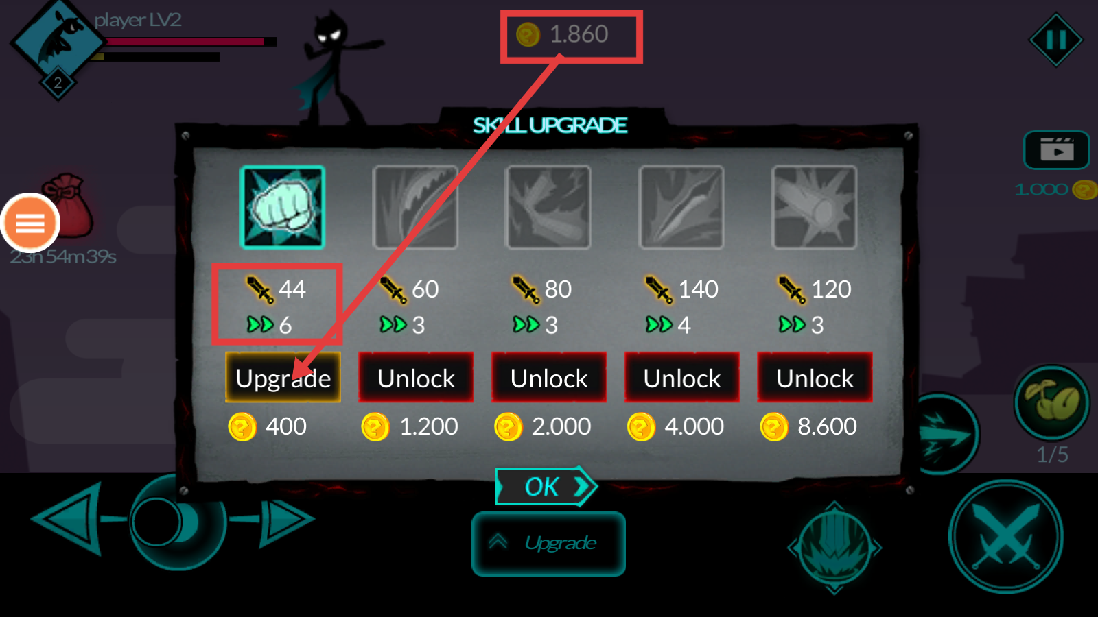 3、进入升级界面,消耗【1.860-金币】点击【Upgrade】提升技能,增强角色战斗能力。