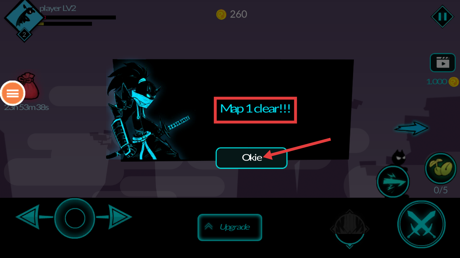 4、Map1通关后,点击【Okie】确认结算,解锁新进度,为后续关卡或地图做规划。