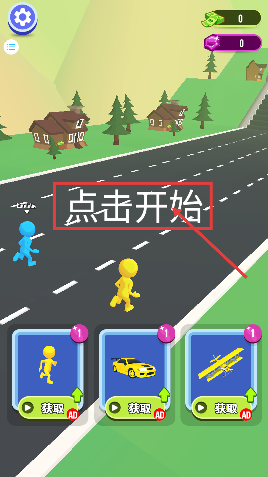 1、点击【点击开始】启动游戏,操控黄色小人起跑,后续可解锁汽车、飞机载具拓展玩法。