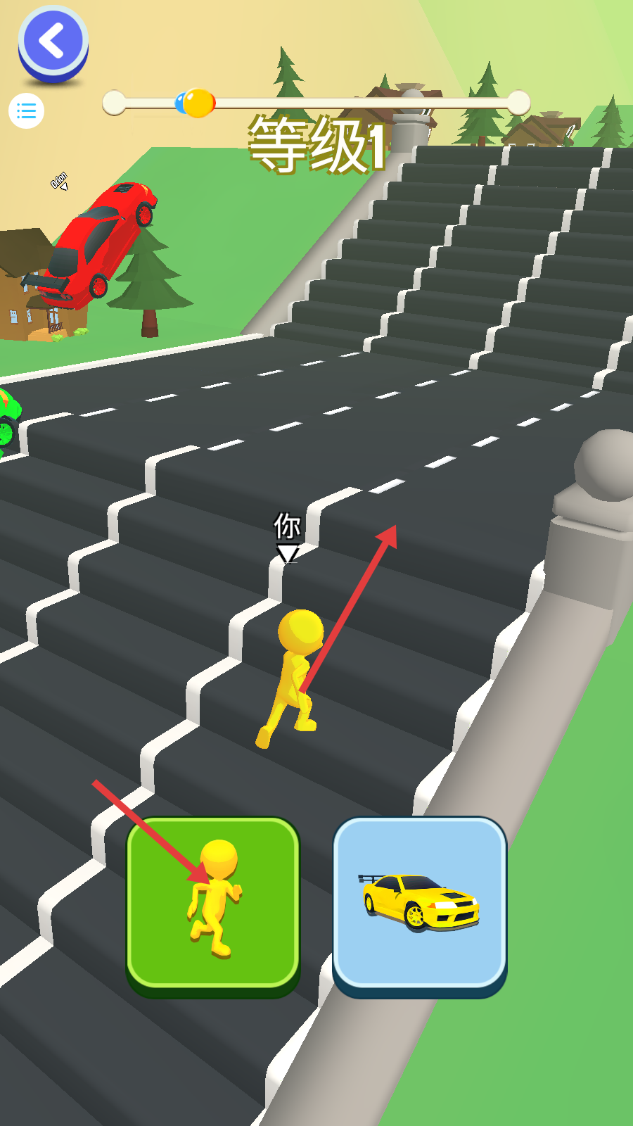 2、等级1挑战中,沿楼梯向上奔跑,适时点击左下角【小人图标】切换形态,适应地形推进。