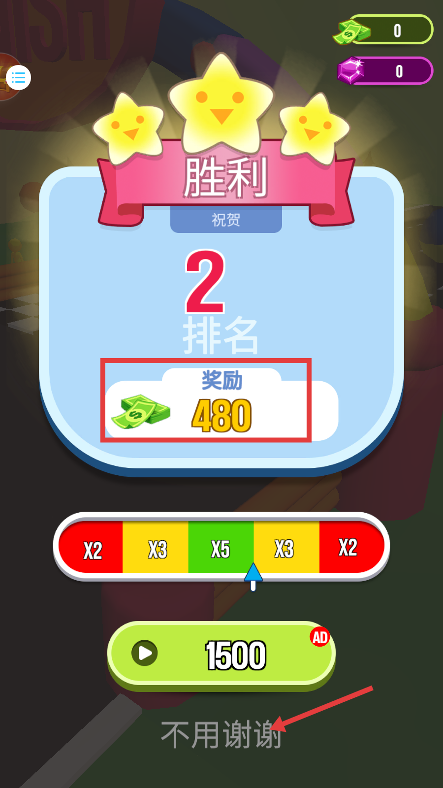 4、胜利后获得【奖励-480】,点击【不用谢谢】跳过广告,快速结算进入下一轮挑战。