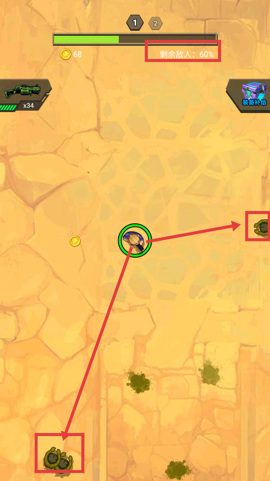 2、战斗中围绕角色清剿周围敌人,关注上方【剩余敌人:60%】进度,逐步消灭所有目标。