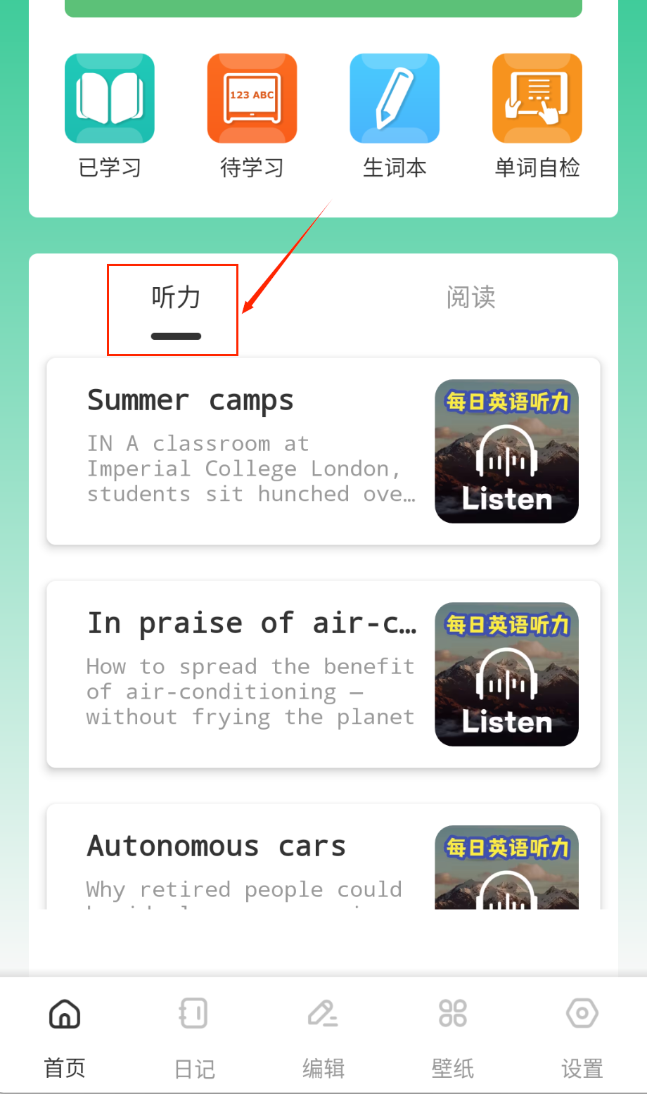 2、听力素材实时更新紧跟时事热点,背景知识补充促进理解。听写模式强化拼写能力,跟读功能改善发音问题。