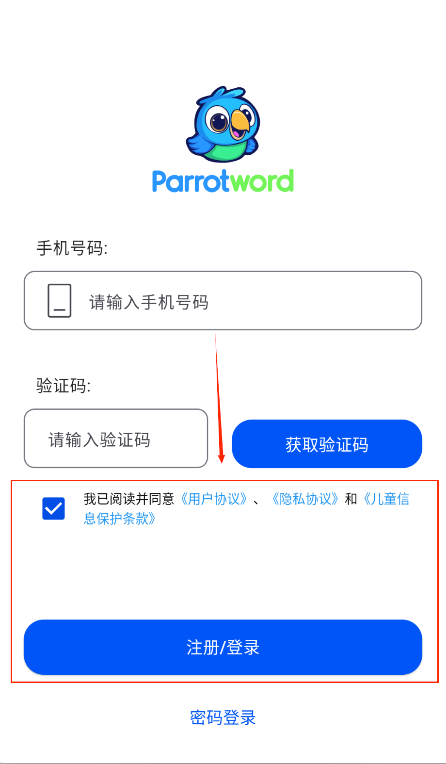 2、密码登录的话要在密码框输入6-12位密码,点击右侧眼睛图标可以显示或隐藏密码。记得勾选同意协议选项。