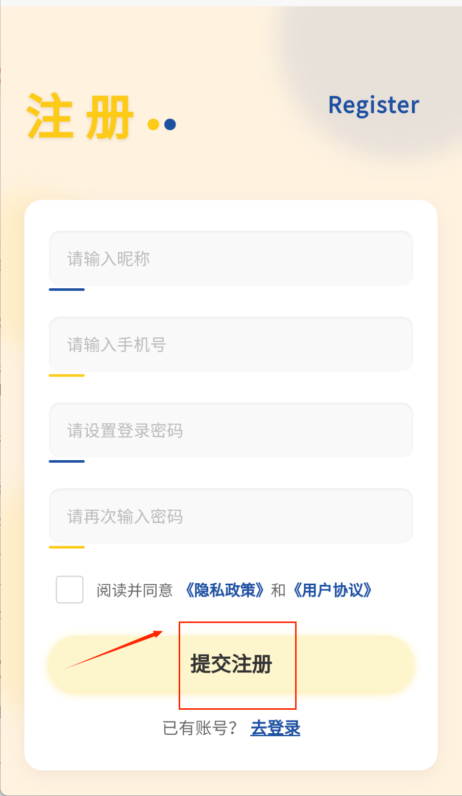1、打开软件后先看看注册入口呢,点击进入注册页面。按照提示依次填写昵称和手机号,注意别输错了哦。