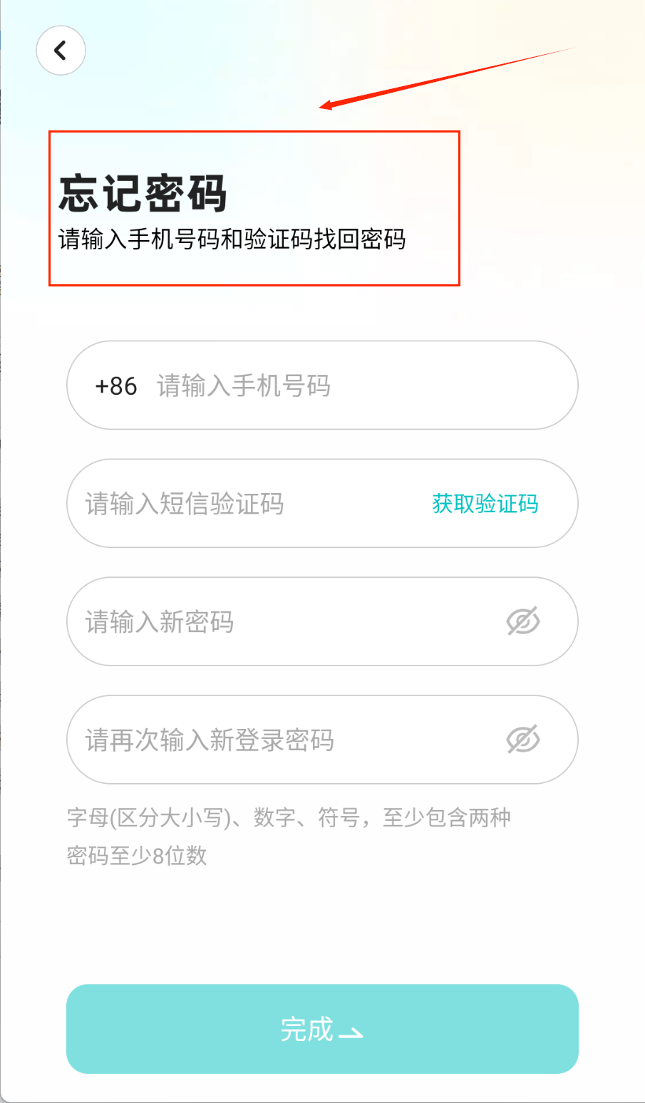 3、忘记密码可以点找回功能,输入手机号获取验证码。设置新密码后要再次确认,保持一致才能修改成功。