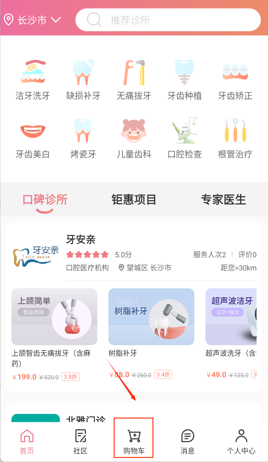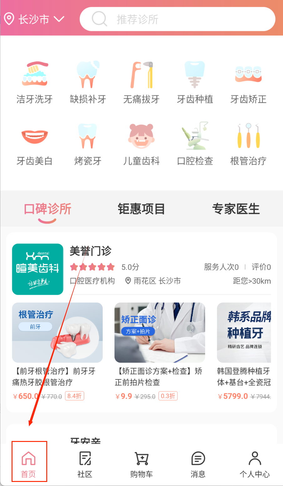 1、下载安装后注册账号,完善个人信息和口腔健康档案。浏览首页推荐的服务项目和热门诊所,了解平台功能布局。