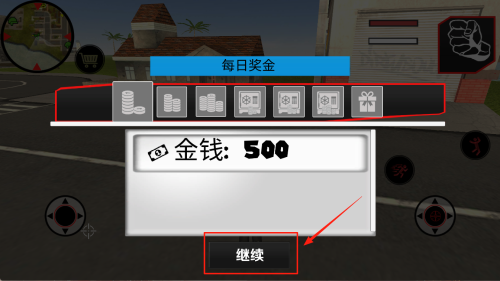 3、在“每日奖金”页面领取500金钱奖励后,点击“继续”前往主菜单。