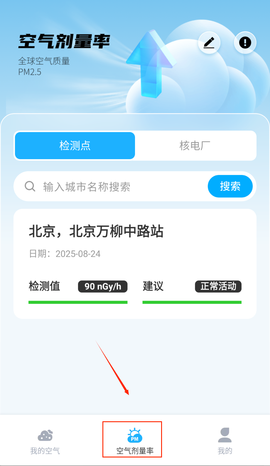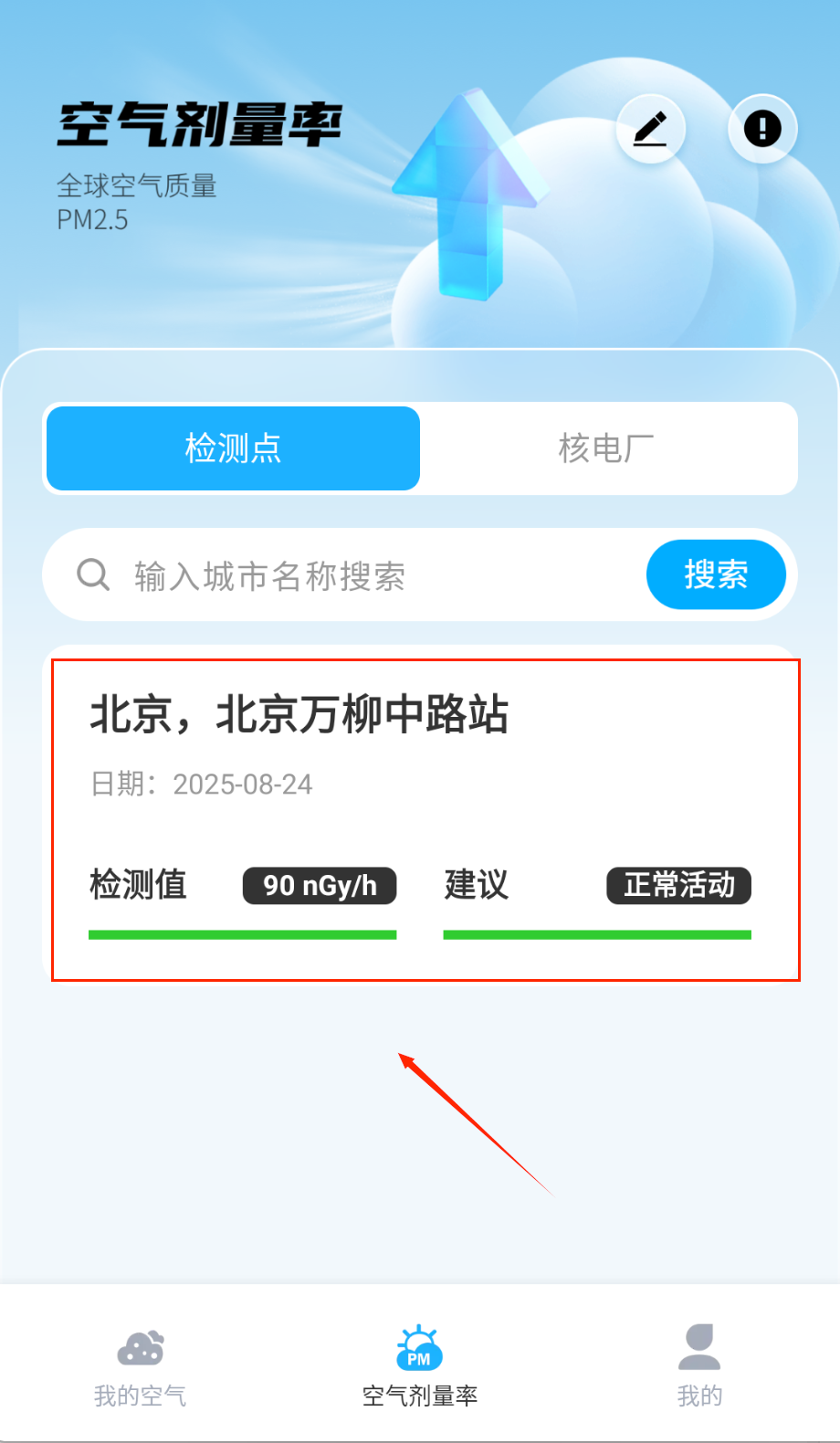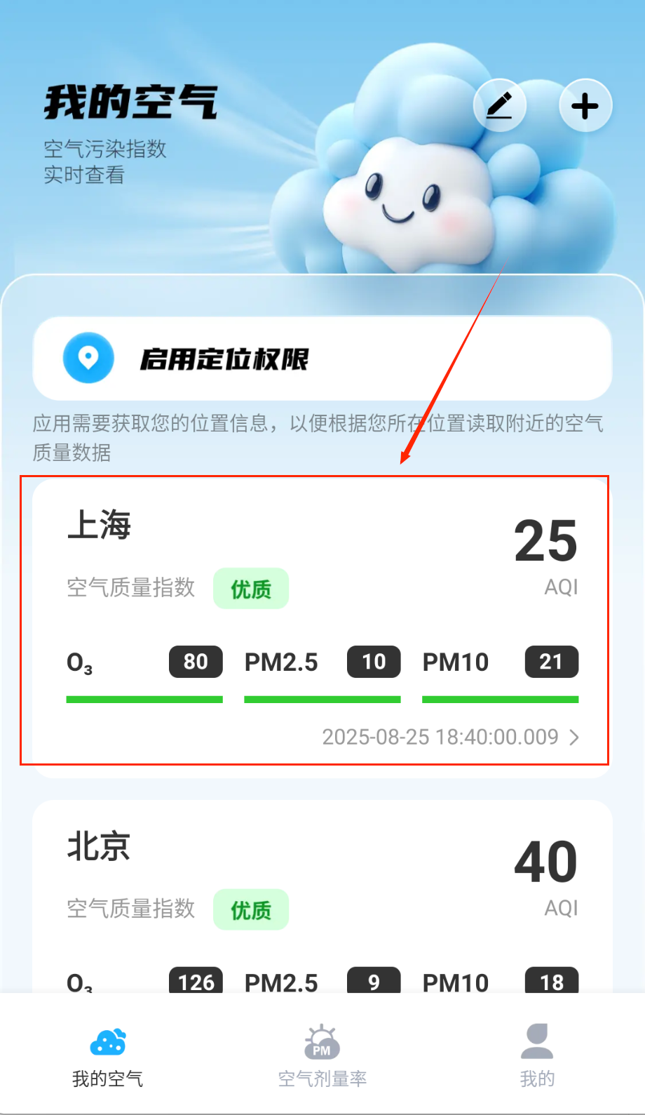 1、打开应用授权定位权限,系统自动展示当前位置的实时空气质量指数(AQI)及首要污染物,了解当前环境健康等级。