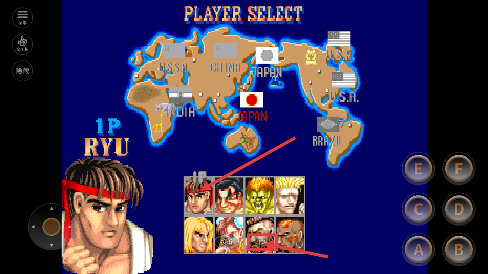 1、在【PLAYER-SELECT】界面选定【RYU】-点击下方【开始】按钮,进入对战环节。