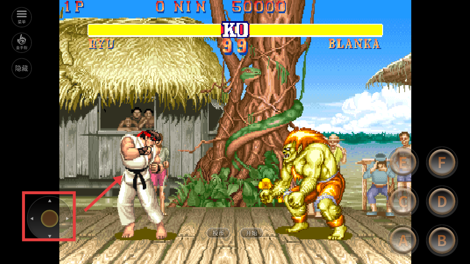 2、左侧圆盘摇杆控制角色移动-调整【RYU】的战斗站位,准备迎战对手【BLANKA】。