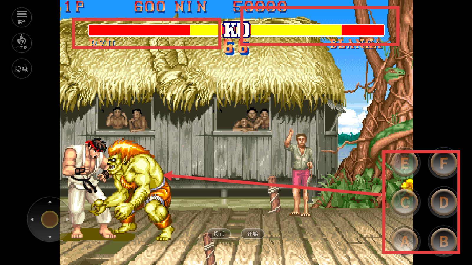 3、关注双方血条状态-利用右侧【A】【B】等按键释放招式,攻击【BLANKA】争夺优势。