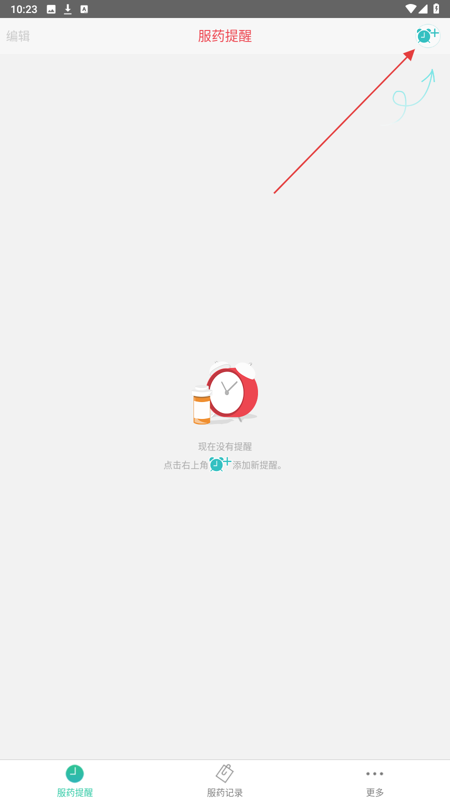 1、进入【服药提醒】页,点击右上角【闹钟+】图标,开始添加新的服药提醒。