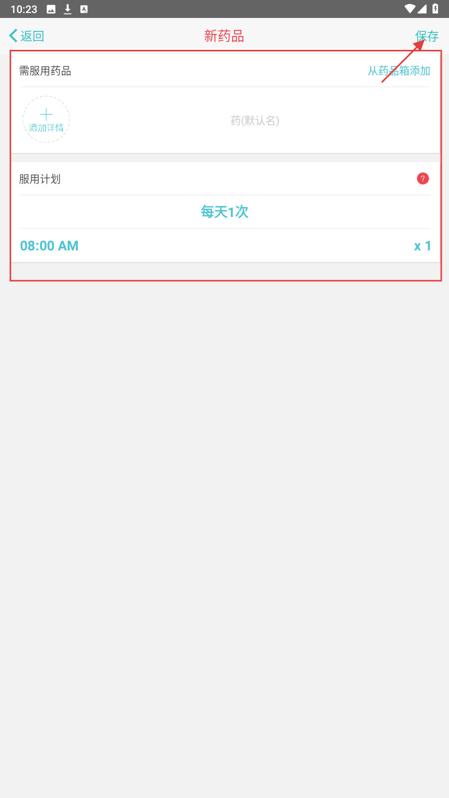 3、填写【需服用药品】及【服用计划】,确认后点右上角【保存】,完成新药品提醒设置。