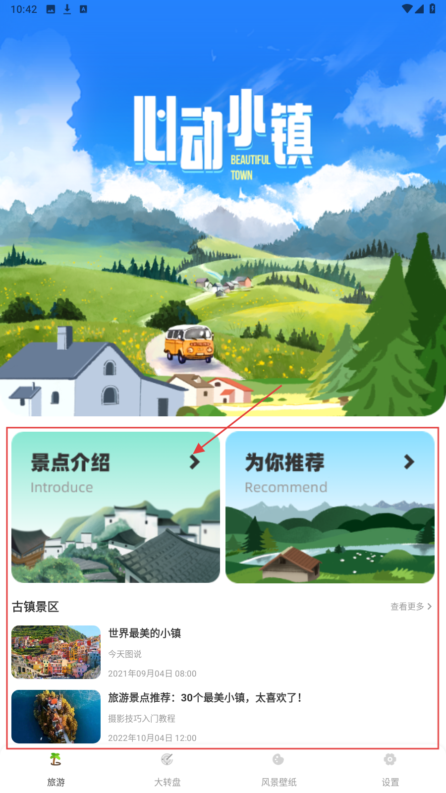 1、了解景点,点首页【景点介绍】,浏览全球最美小镇、古镇推荐等旅游文章。