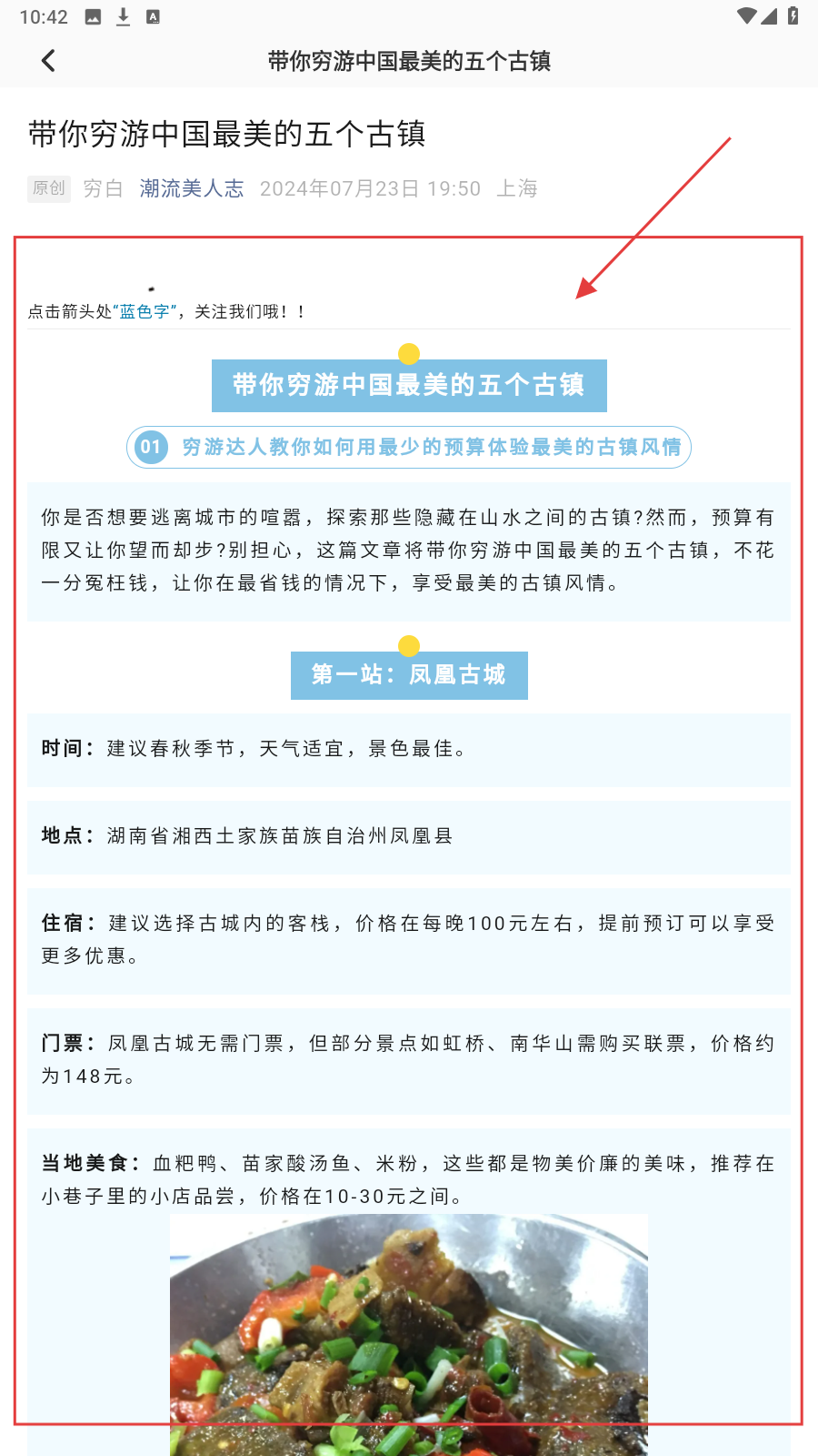 3、看古镇攻略,进入文章后,了解凤凰古城等古镇的游玩时间、住宿、美食等信息。