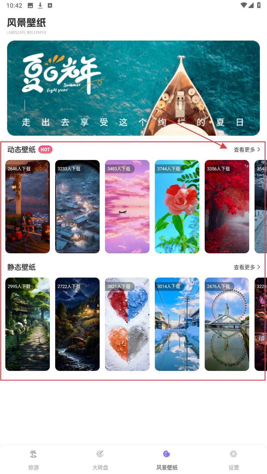 4、下载壁纸,点【风景壁纸】,选动态或静态壁纸,点【查看更多】找喜欢的下载。