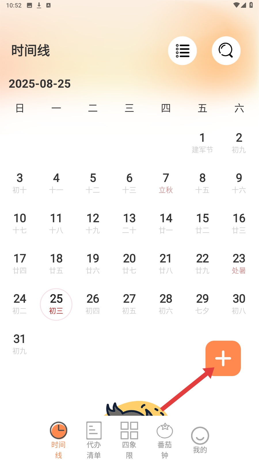 1、在【时间线】页,点击右下角橙色【+】,可开启添加新时间事件流程,规划日程。