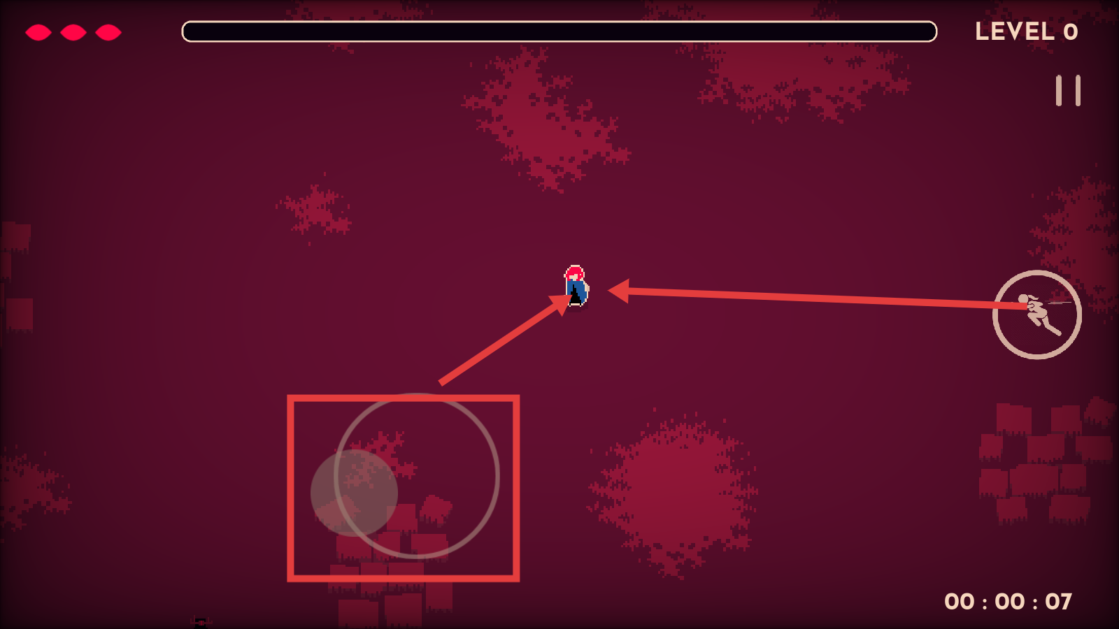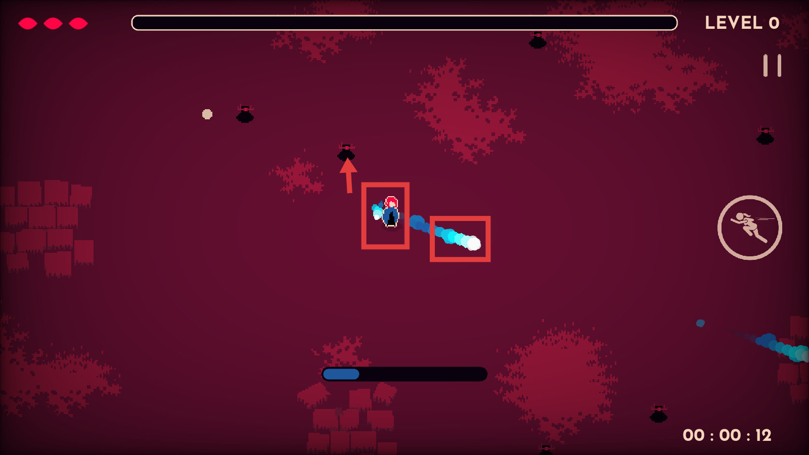 2、摇杆控角色移动-点右侧技能键,发射火球攻击黑色小怪。