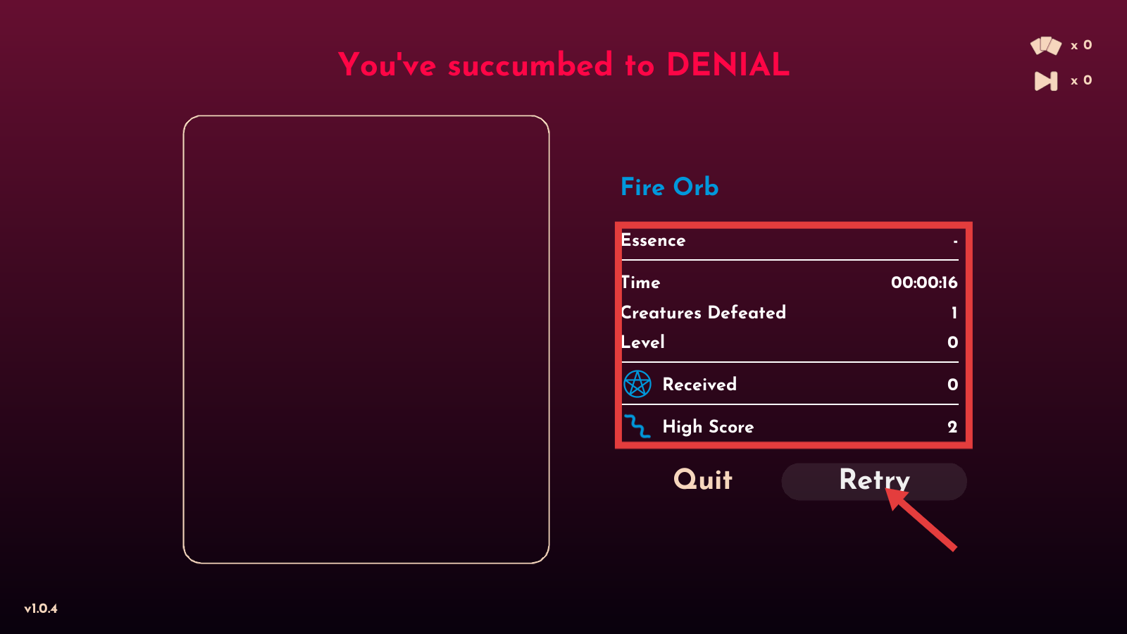 4、失败页看【时间/击杀】数据-点【Retry】重开,优化技能释放节奏。