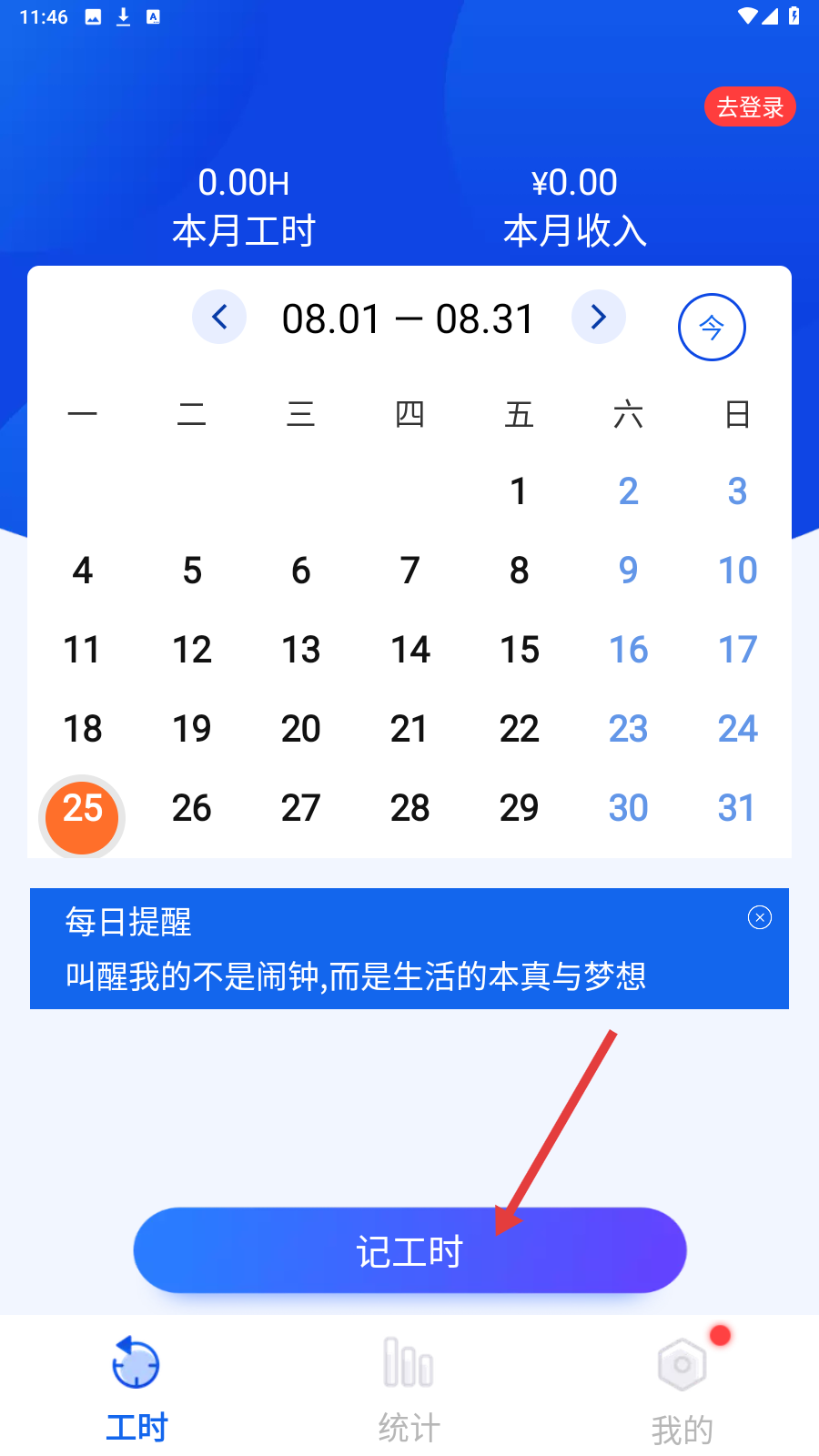 1、在【工时】页,点【记工时】,进入工时记录流程,开始记录工作时长。