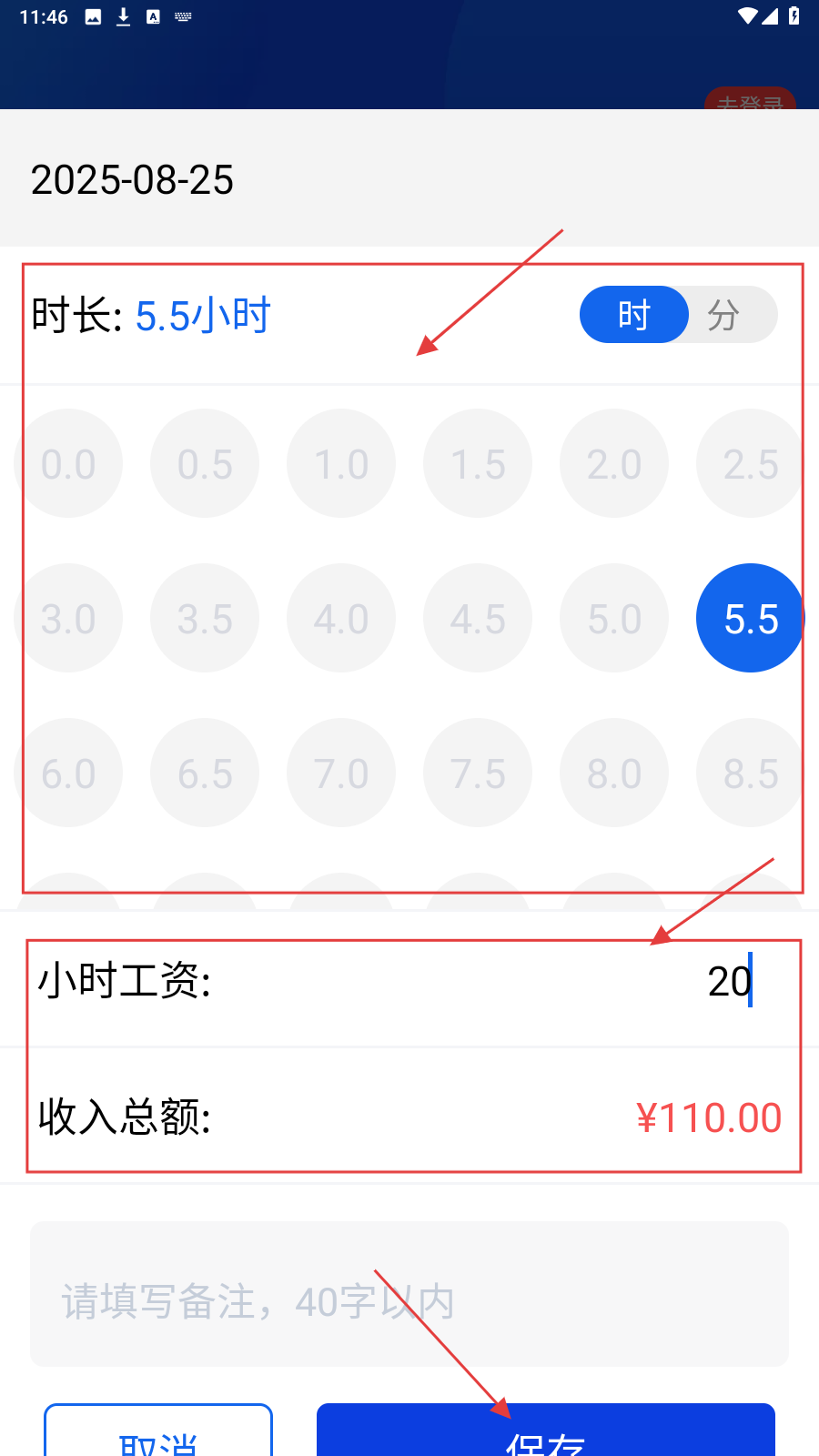 2、在记录页,选时长、填小时工资,系统自动算收入总额,点【保存】完成记录。