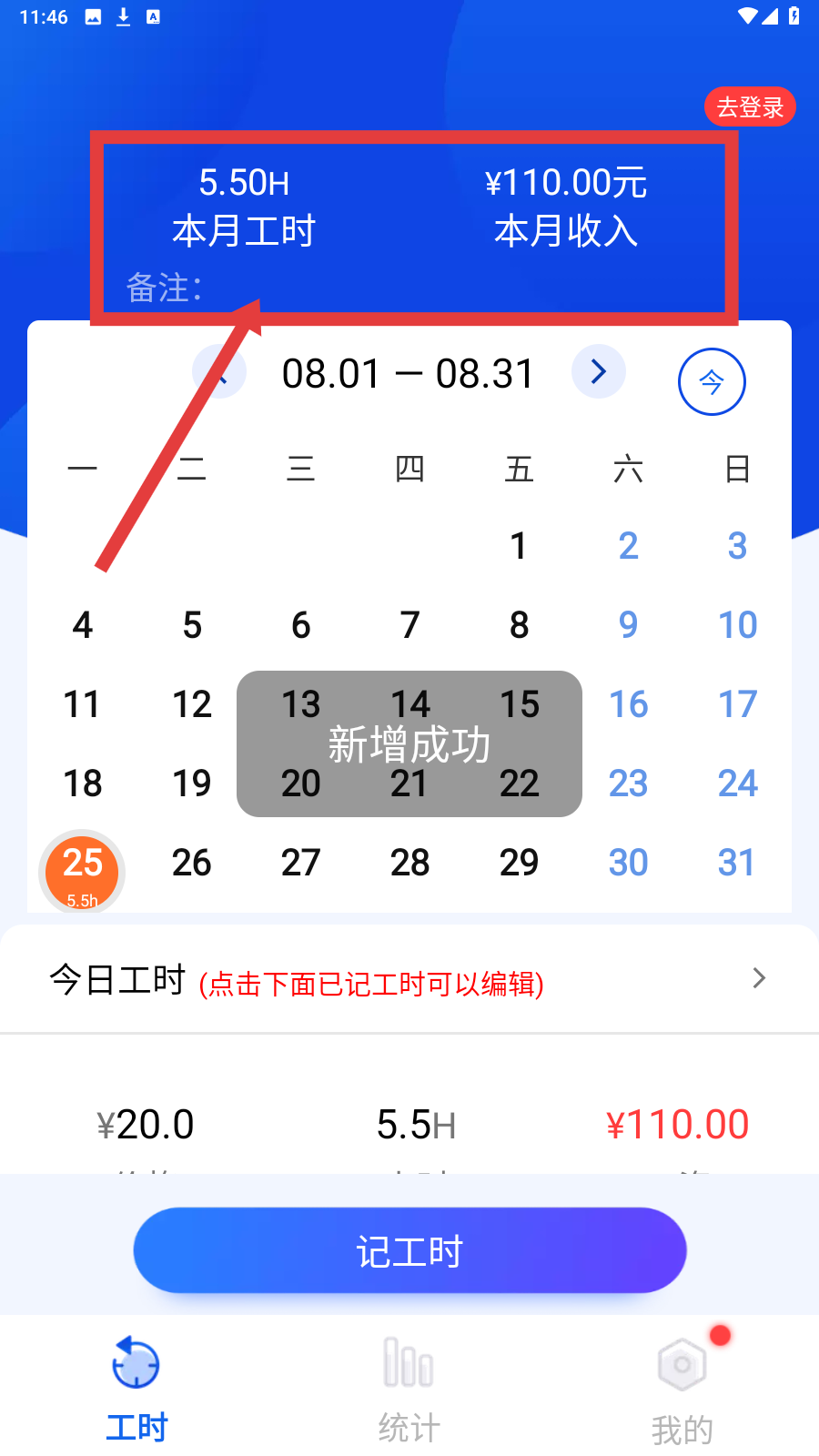 3、返回【工时】页,顶部显示本月工时、收入,确认新增成功,查看记录。