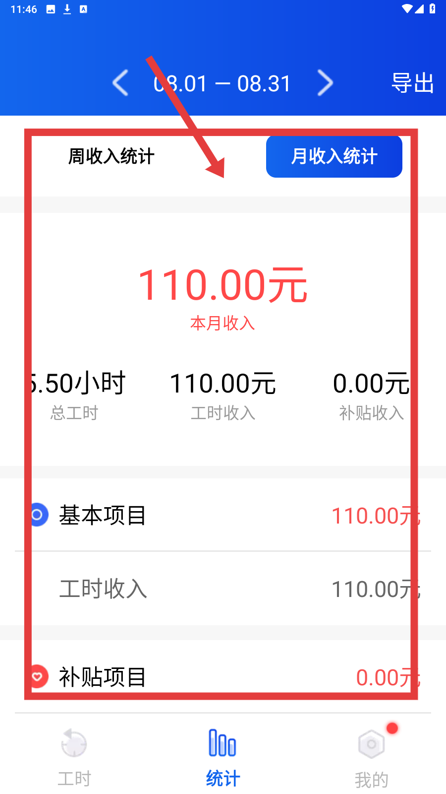 4、切换到【统计】页,选【月收入统计】,查看本月收入、工时等详细统计数据。