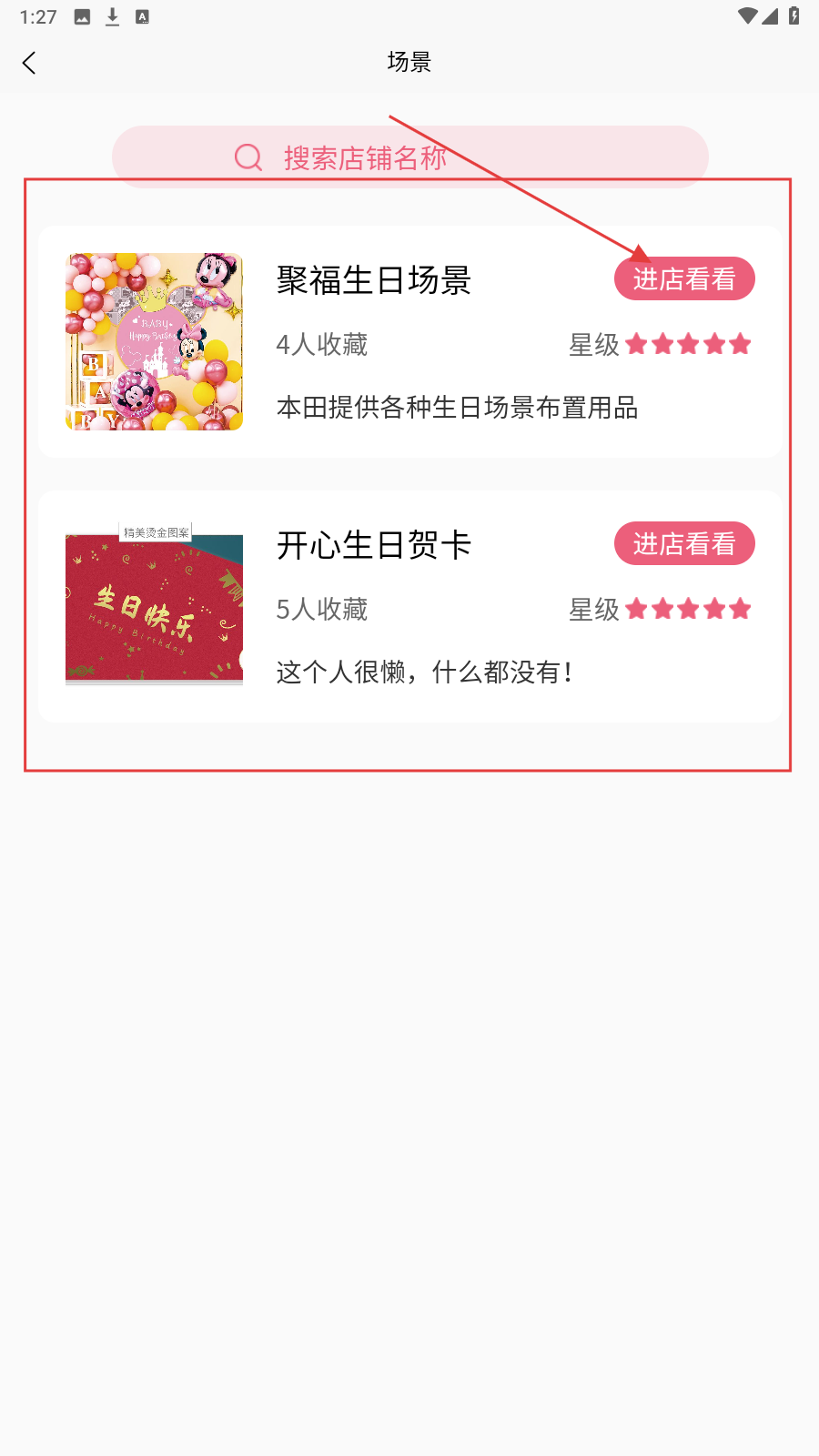2、点【聚福生日场景】店铺的【进店看看】,浏览店内生日场景套餐。