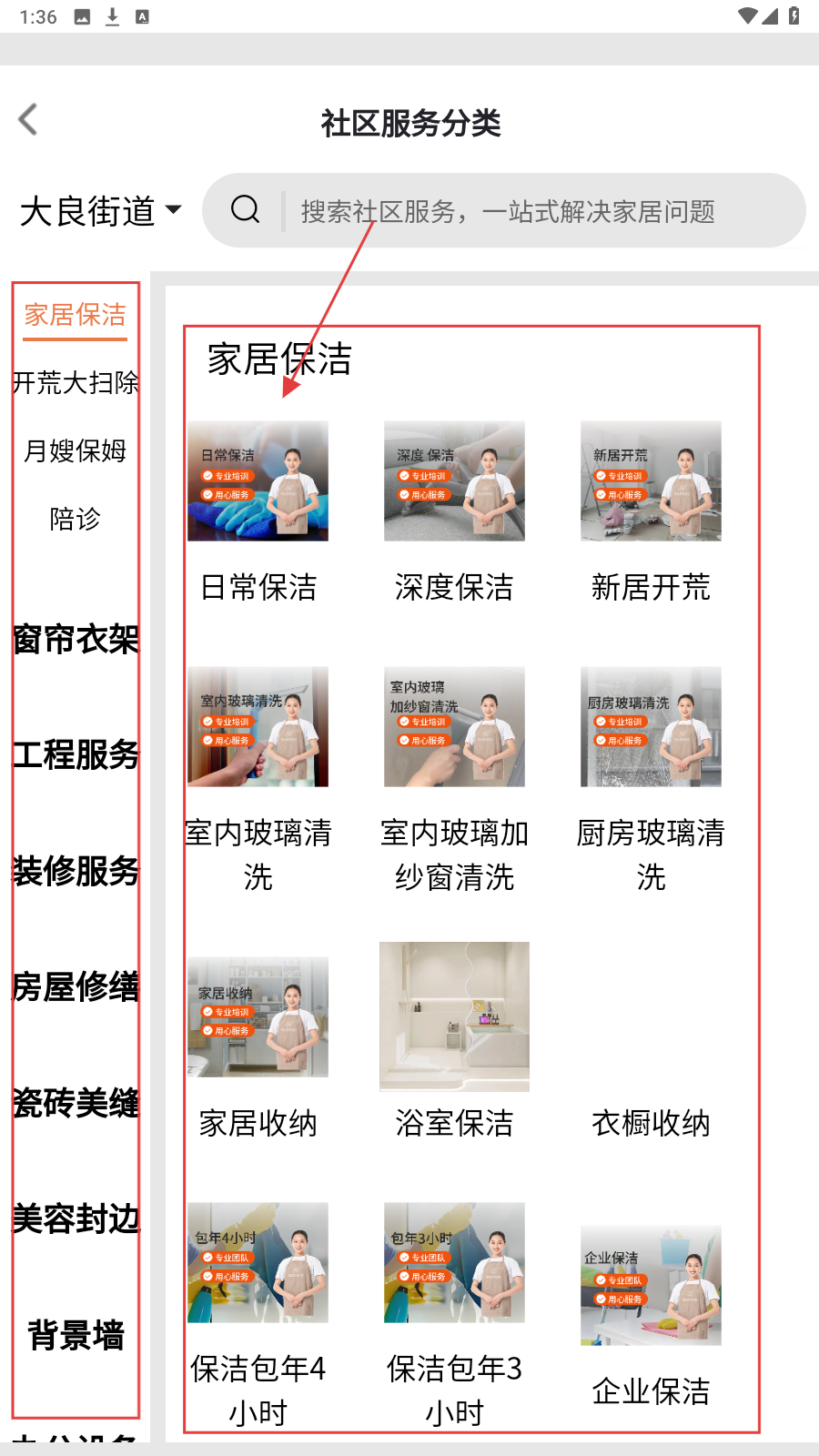 2、在分类里找具体服务,如【家居保洁-日常保洁】,查看服务详情。