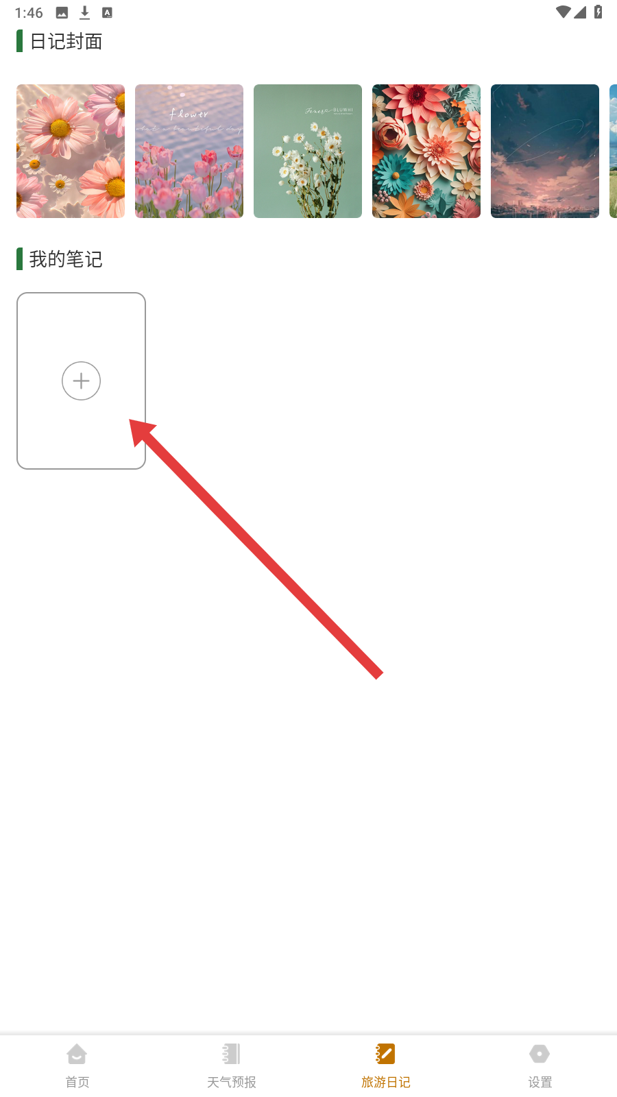 4、切换到【旅游日记】,点【我的笔记】下【+】,创建旅行记录笔记。