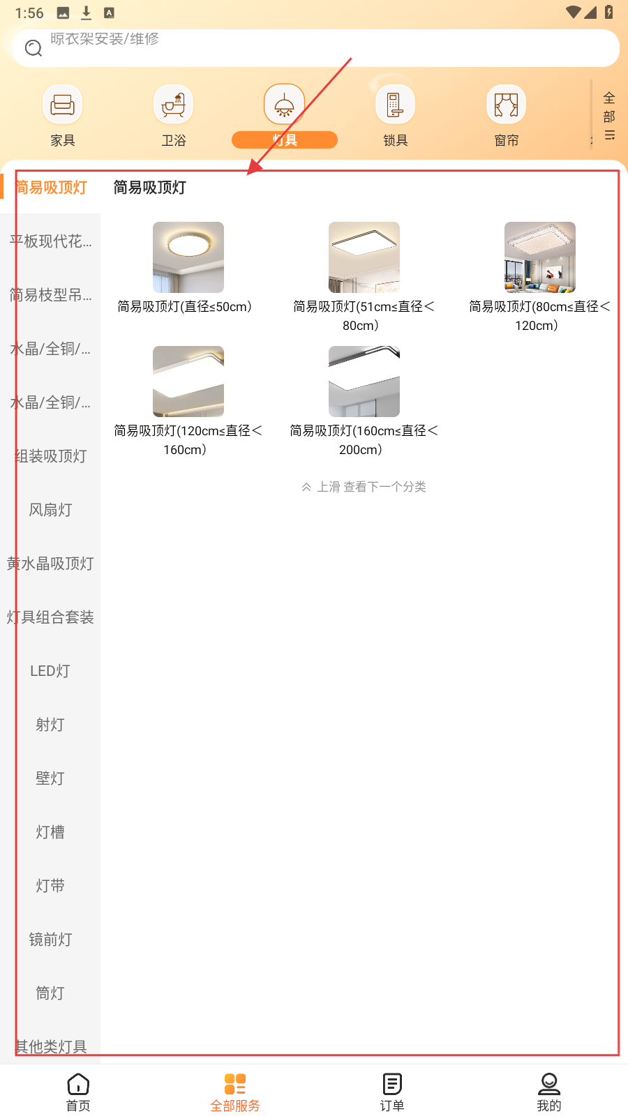 2、在全部分类里,精准点选【灯具】分类,缩小服务范围。