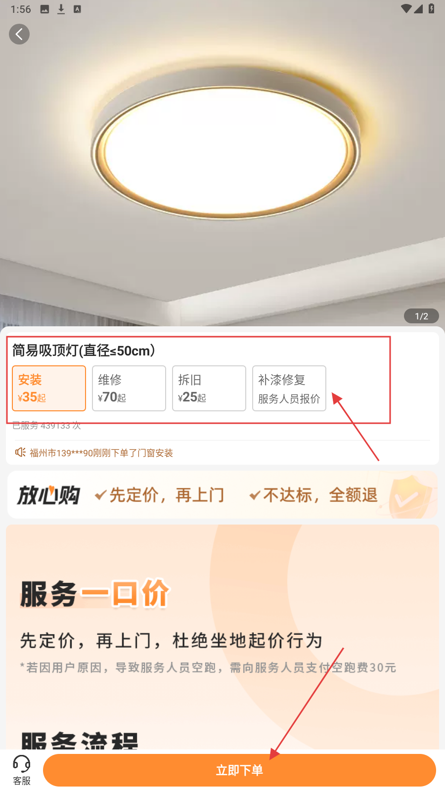 4、选好服务项目(如安装),确认后点【立即下单】,提交需求。
