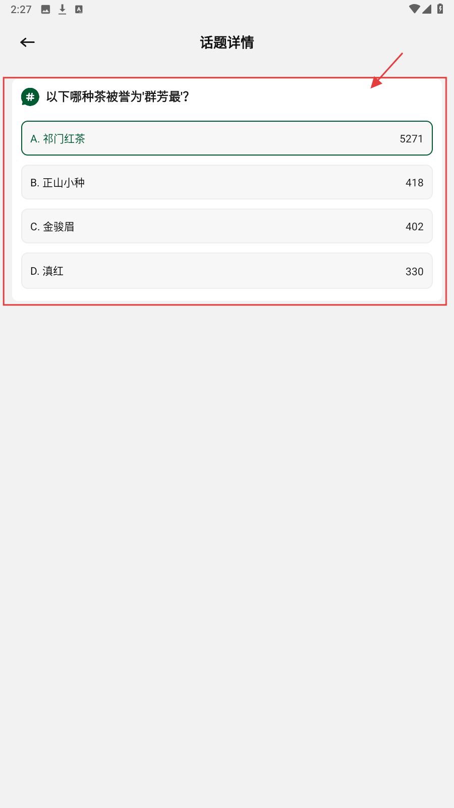 2、在【热门话题】页,选感兴趣问题,如【以下哪种茶被誉为群芳最?】答题。