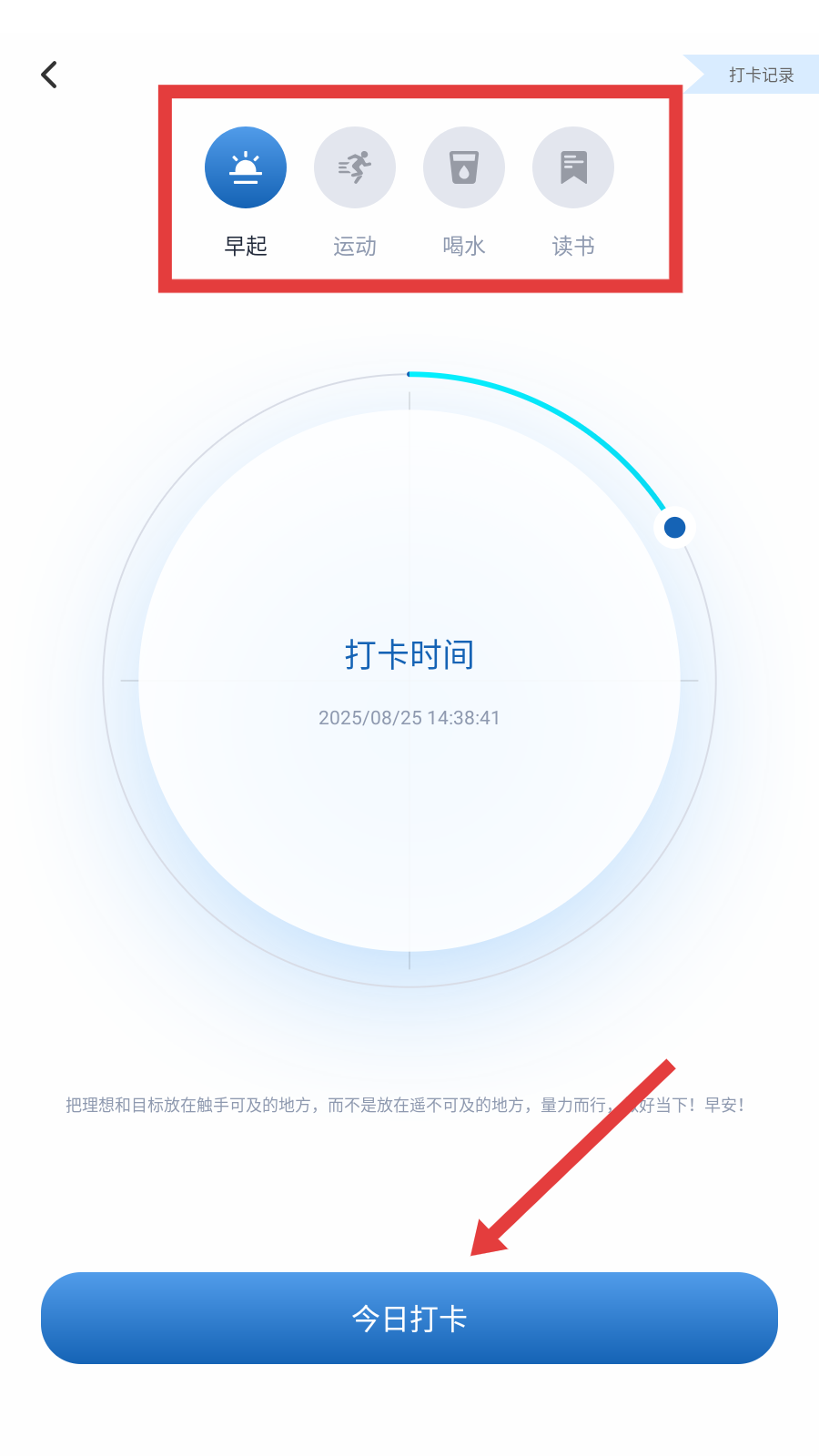 2、在打卡页,选【早起】等任务,点【今日打卡】完成打卡。