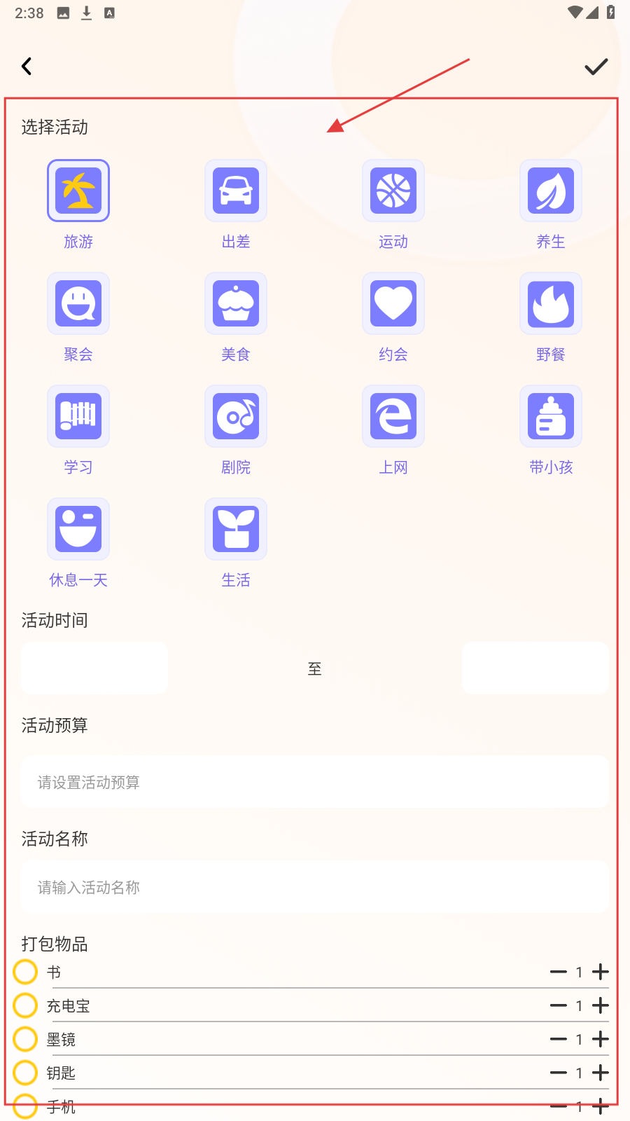 4、选活动类型(旅游等),填时间、预算等,保存活动计划。