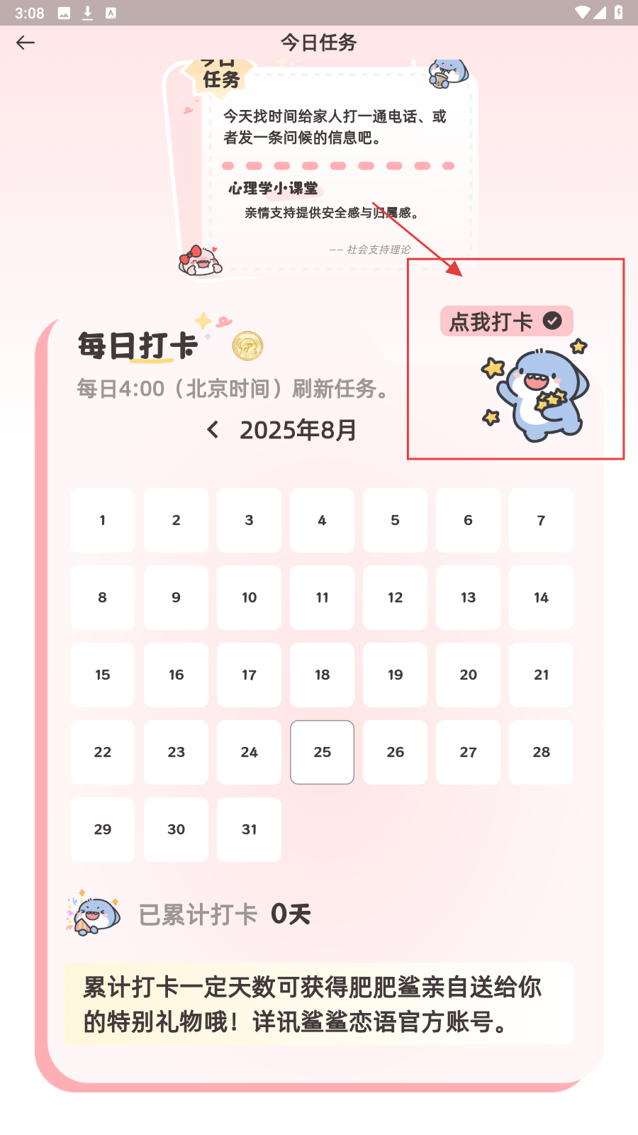 2、在【今日任务】页,完成任务后点击【点我打卡】完成当日打卡。