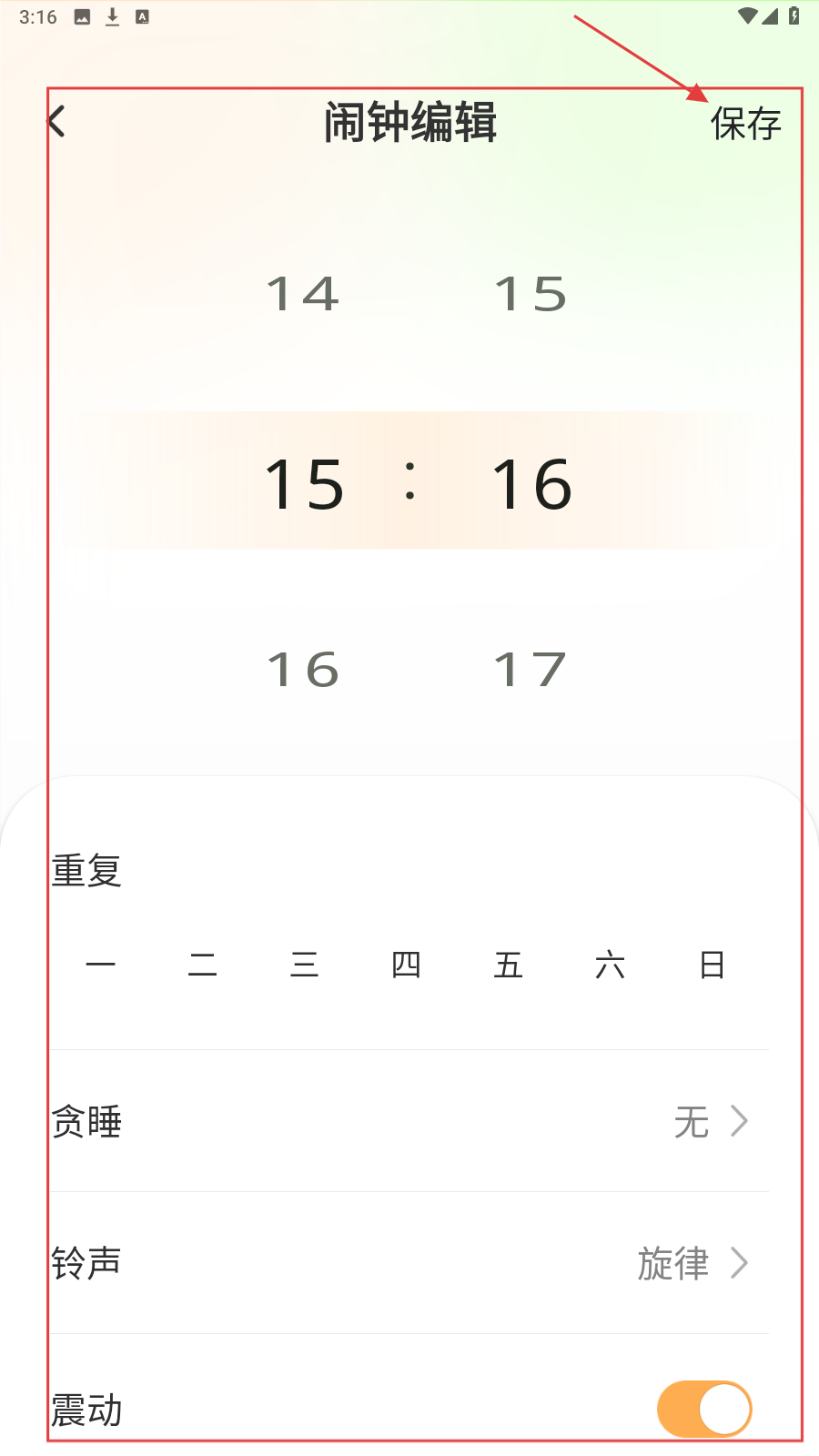 2、在【闹钟编辑】页,设定时间、重复等参数,点【保存】完成设置。