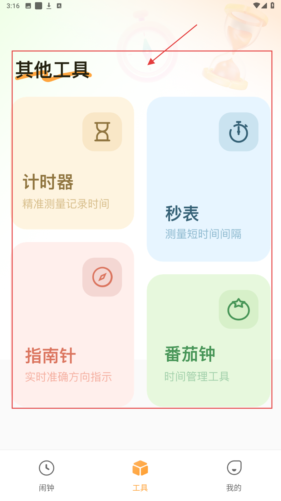 4、切换至【工具】页,按需选择【计时器】【秒表】等工具进行使用。