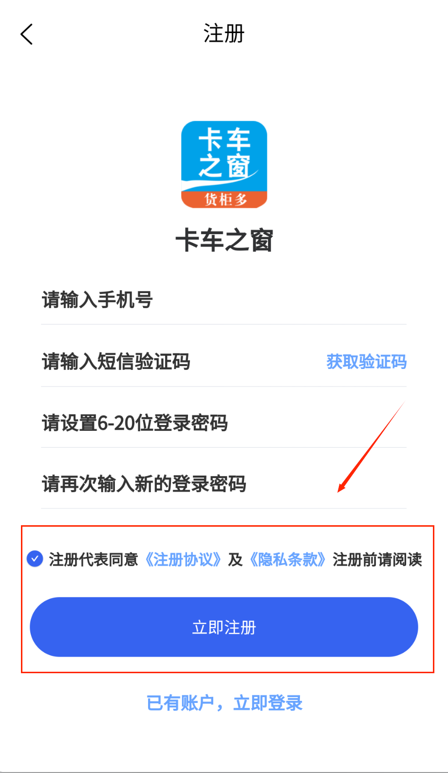 2、输完信息记得勾选同意协议那个小圆圈,最后点蓝色立即注册按钮就好啦,有账号的话直接去登录页面哦。