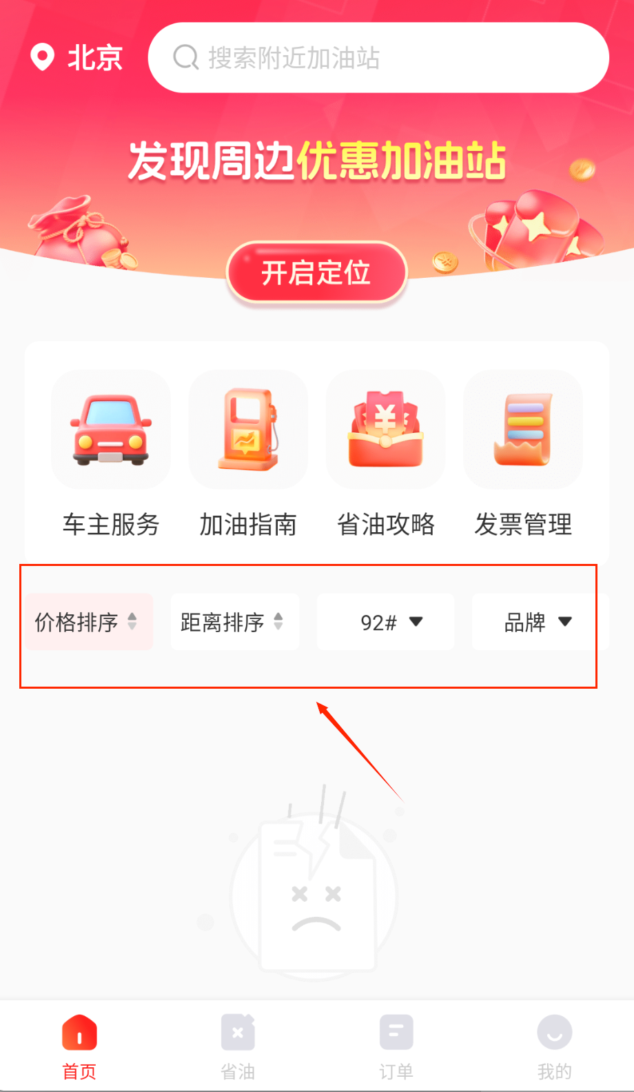 1、打开应用授权定位权限后,系统自动展示周边5公里内加油站列表,按价格排序筛选最优惠油站,查看详细地址与导航路线。
