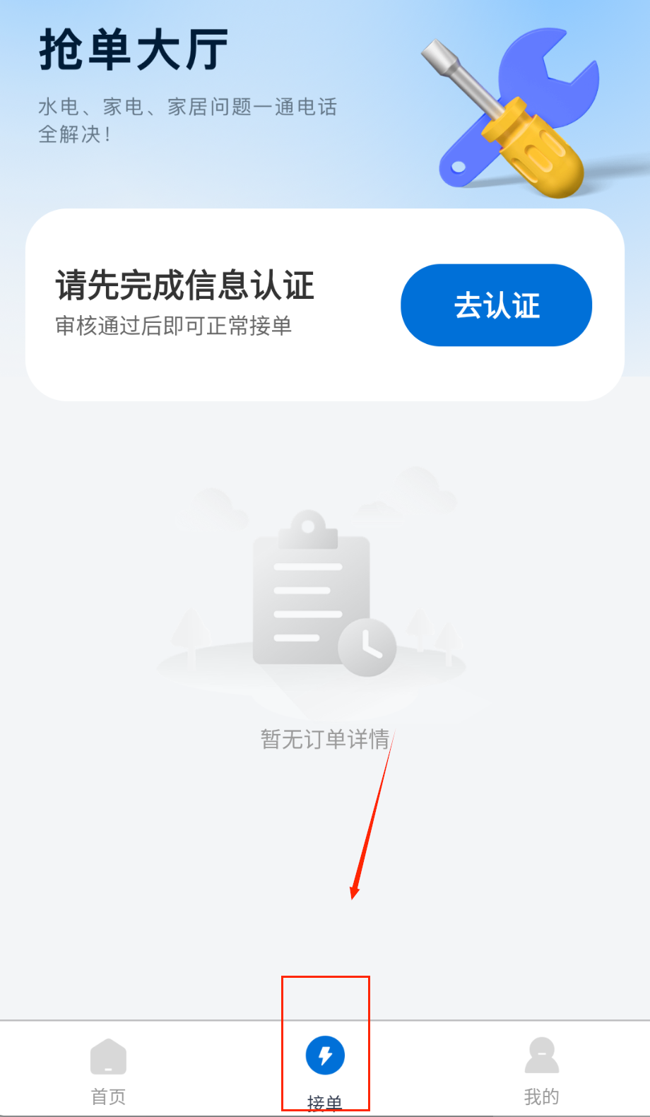 1、完成技师认证并上传相关资质证明,系统审核通过后即可在抢单大厅浏览周边维修订单,根据距离和服务类型筛选合适订单。