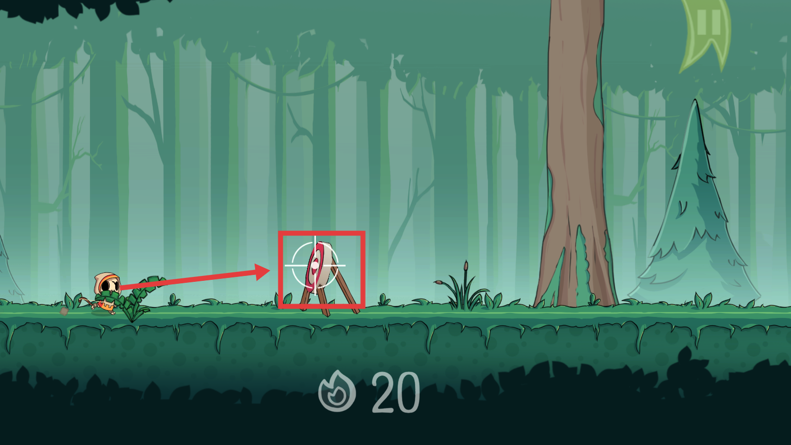 2、操控角色靠近【靶心】射击,消耗底部【20】火焰计数,完成射击目标推进游戏流程。