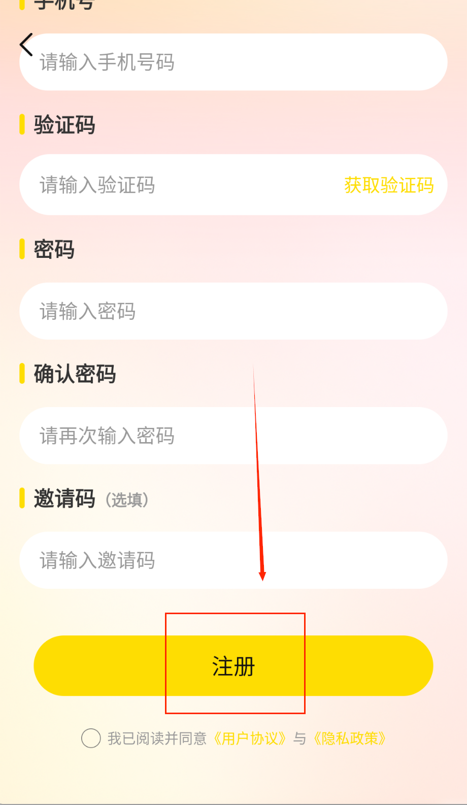 1、打开应用后点击立即注册按钮,输入手机号并获取验证码,设置登录密码后勾选用户协议就能快速完成账号注册呢。