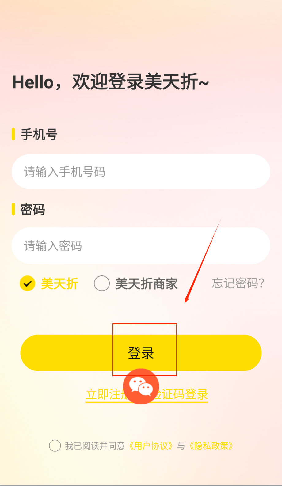 2、在登录页面选择验证码或密码登录方式,输入对应信息后记得勾选同意协议选项,点击黄色登录按钮即可进入主界面。